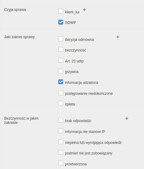 Na ekranie dodawania sprawy "Opcje Cechy" (oznaczone jako "Cechy") wymagają zmiany. Dostępne opcje powinny być pogrupowane według "Cechy" i wykorzystywać checkbox. W obecnym rozwiązaniu jest to widoczne jako: