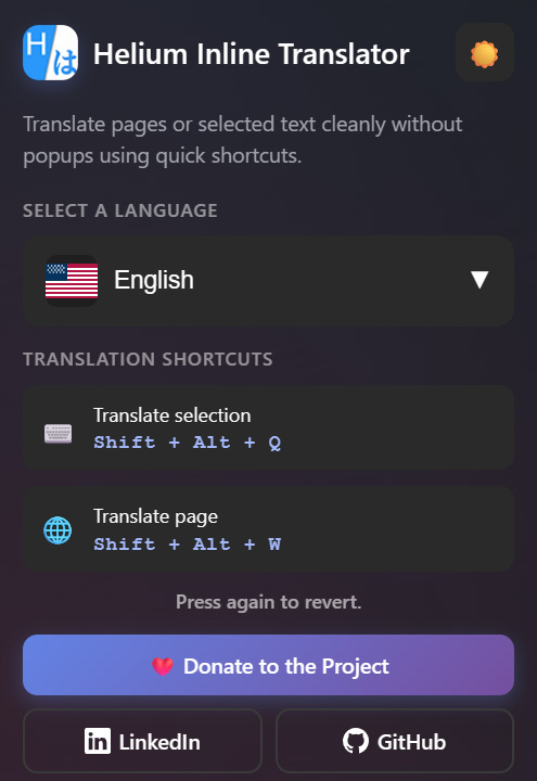 The project started when moving from Microsoft Edge to Helium Browser revealed the lack of a translation flow comparable to Edge’s native feature, so the extension was built to fill that gap—and it works seamlessly in any Chromium browser, including Chrome and Edge. Fast shortcuts keep the workflow fluid while the interface stays clean.