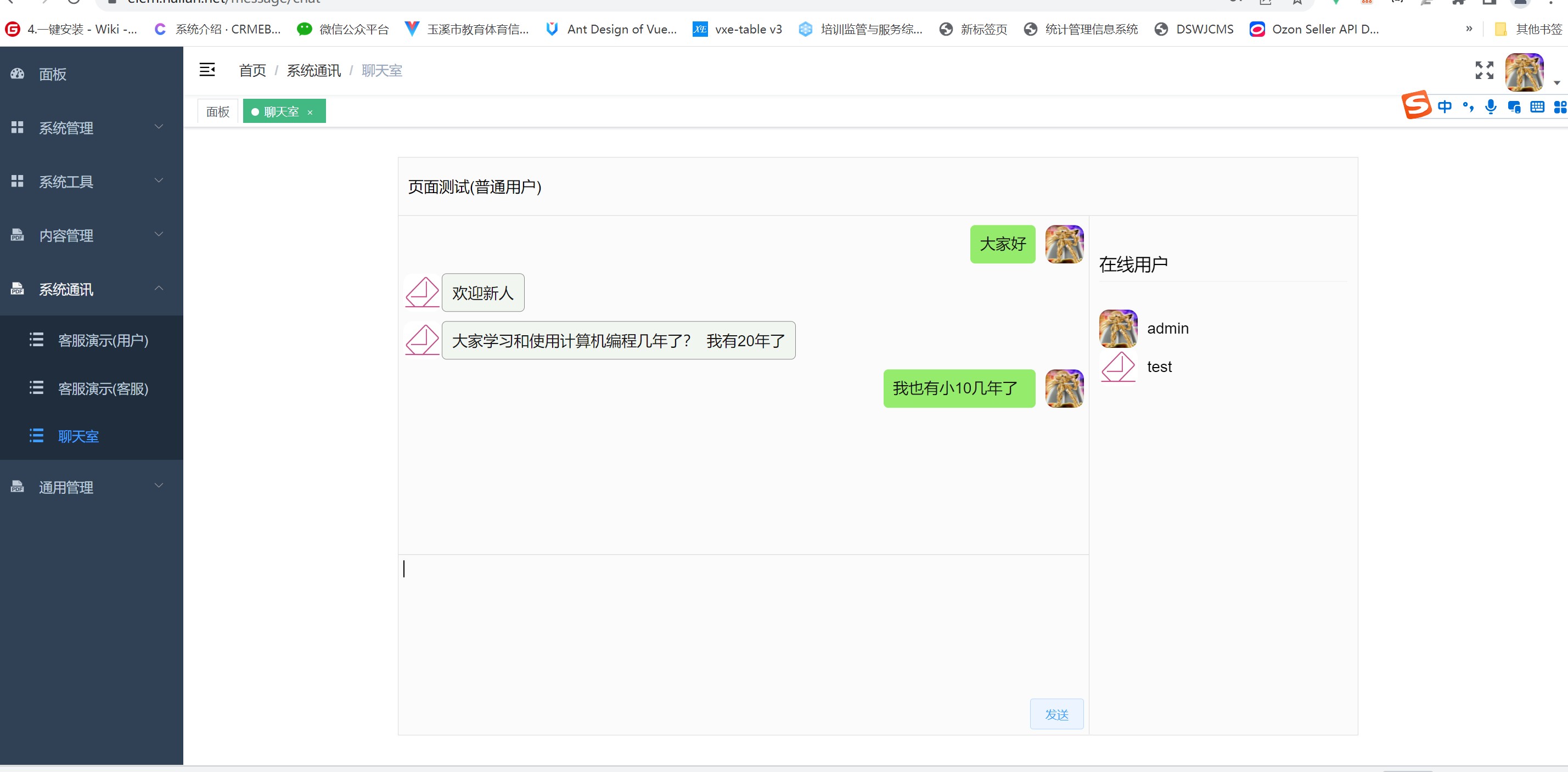 为了演示聊天室和客服等功能,用户可以进入系统后首先创建多个用户,并且利用不同的浏览器同时登陆,就可以演示相关功能。