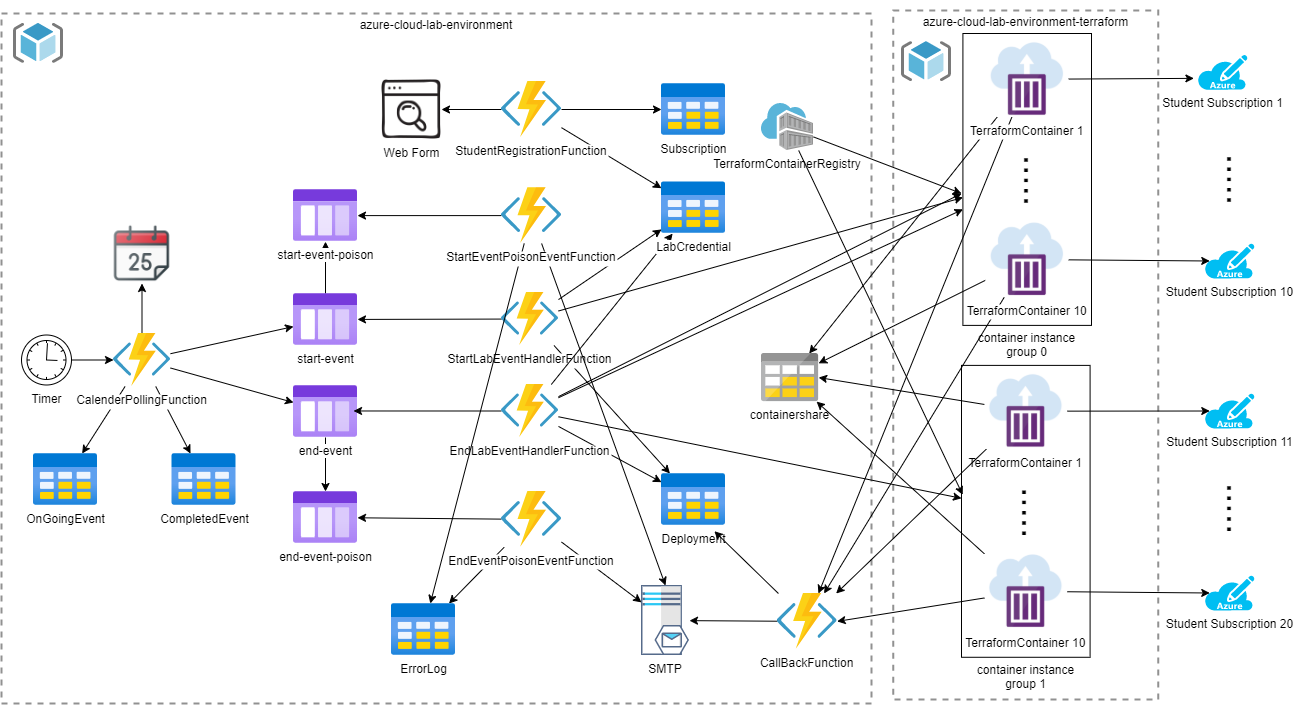 They handle the message of start-event queue and end-event queue respectively. They are very similar, and the only difference is the container starting command – deploy.sh and undeploy.sh. they convert the event message into lab object for common parameters such as lab, GitHubRepo, Branch, and Repeated Times. They query the LabCredential table and get the list of students with services principal data. Each student subscription is handled by one Terraform Container, and pass services principal and other data through environment variables. 1 container group holds 10 containers. They record the creating and deleting activities in Deployment table.