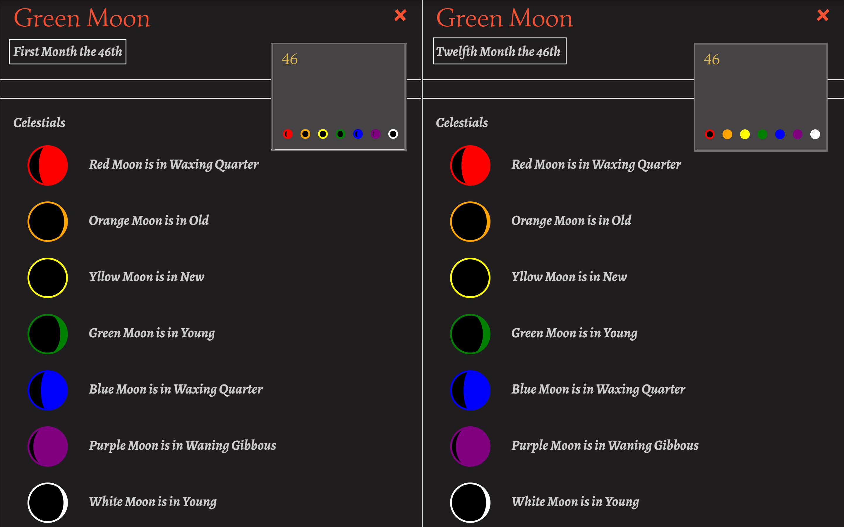 When viewing celestial bodies from the calendar via the modal after clicking on them, the images don't match the ones on the calendar table for all months but the first. The months following the first display in the modal as if they where days from the first month. Using either the link to the calendar I made or looking at the attached side-by-side the 46th of the first month and the twelfth month have different moons on the calendar table which are accurate but the modal images match the first months.