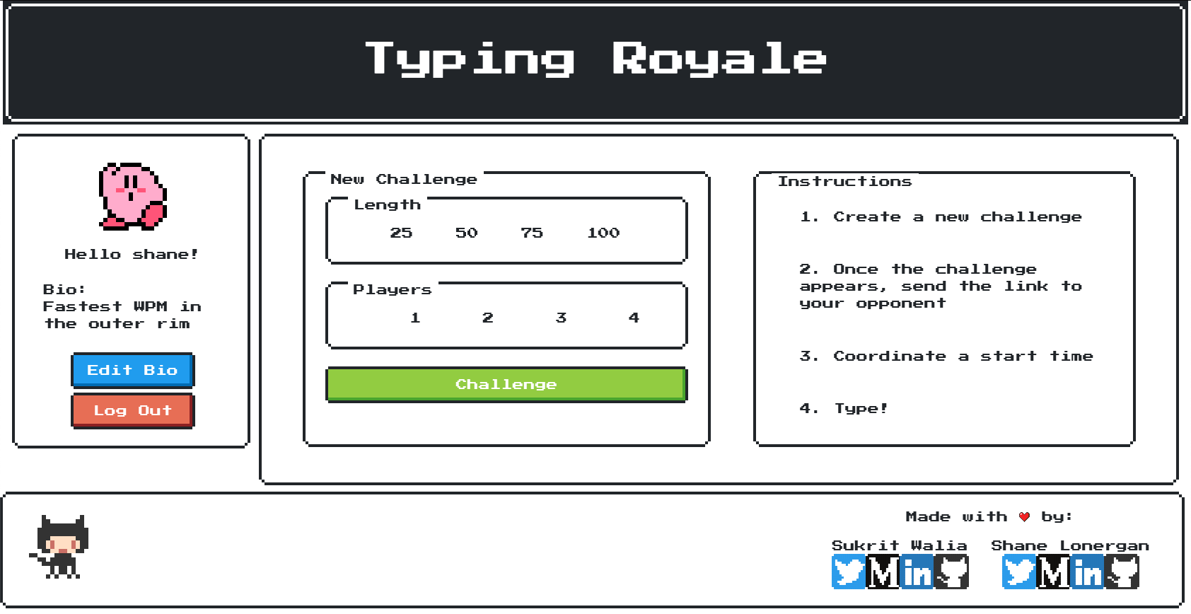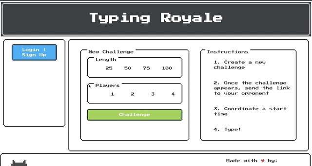 Inspired by single-player typing websites, Typing Royale was created to settle, once and for all, who is the fastest typist in the office. Sure, you can take individual typing tests and compare results, but where is the fun in that? A live, head to head, adrenaline-pumping battle with all bragging rights on the line? Now that's is a true typing test. Good luck, and may the fastest typist win 🏆🏆🏆.