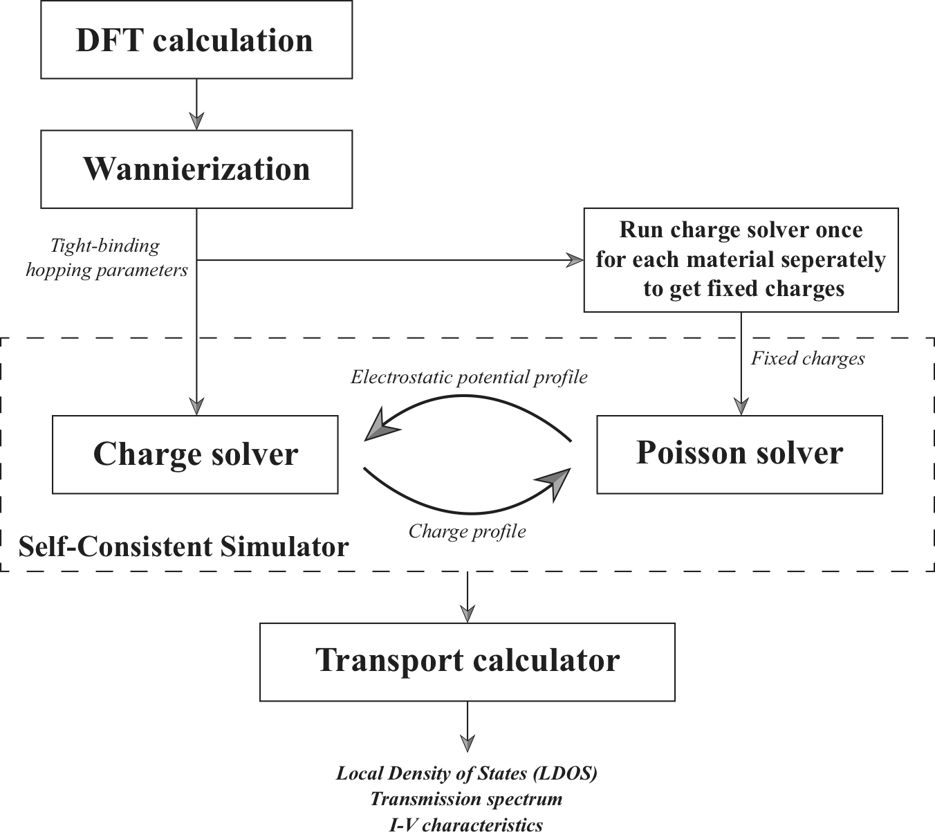 Swan (Self-consistent Wannier-function-based quantum transport solver) is an open-source C++ software suitable for large-scale atomistic simulations of electronic structures and transport properties for nano-devices. By using a Wannier function basis (as implemented in the Wannier90 package) to accurately describe the electronic bands, our code is able to efficiently model device structures with first-principles accuracy at a minimal cost of tight-binding calculations. It couples the Keldysh non-equilibrium Green's function formalism and Poisson solver to generate the inhomogeneous charge densities self-consistently with the electrostatic potential profile for the simulated device region. The parallel implementation of the code uses the standard Message Passing Interface (MPI). We depicted our simulation pipeline as below: