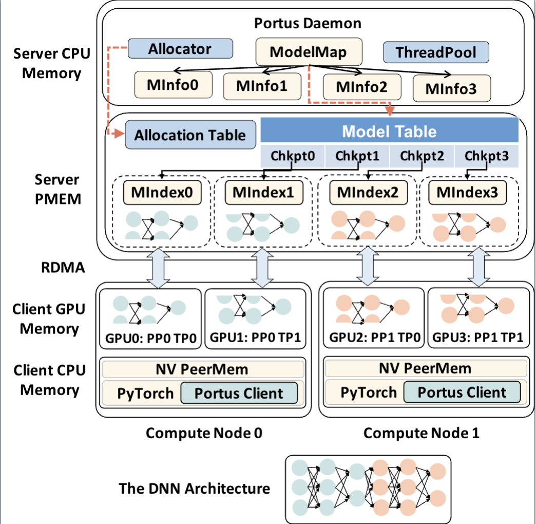 Portus is an efficient checkpointing system for DNN models. The core of Portus is a three-level index structure and a direct RDMA datapath that enables fast checkpoints between GPUs and persistent memory in a serialization-free way. Portus offers a zero-copy approach between GPU and persistent memory without involving main memory and kernel crossings to underlying file systems. Portus also applies an asynchronous mechanism to hide the checkpointing overhead in the model training procedures. We integrated a Portus prototype into a high-performance AI cluster with NVIDIA V100 and A40 GPUs and Intel Optane persistent memory, then evaluated its performance in both single-GPU and multi-GPU large model training scenarios. Experiment results show that compared to a state-of-the-art checkpointing system, Portus achieves up to 9.23× and 7.0× speedup in checkpointing and restoring, respectively. Portus achieves up to 2.6× higher throughput and 8× faster checkpointing operation on a large language model, GPT-22B.