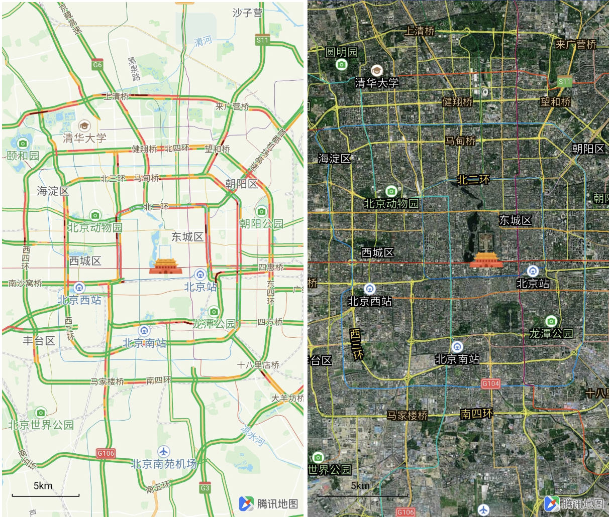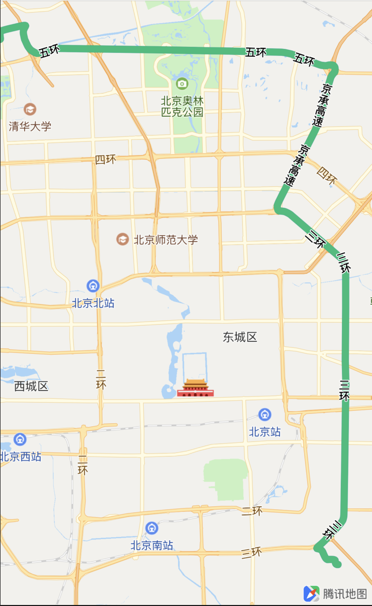 标准地图的信息包括路网信息、建筑物及重要的自然景观;腾讯地图还提供了实时路况图层,可以为提供实时交通数据的城市展示实时交通状况,设置显示标准地图和实时路况的示例代码如下: