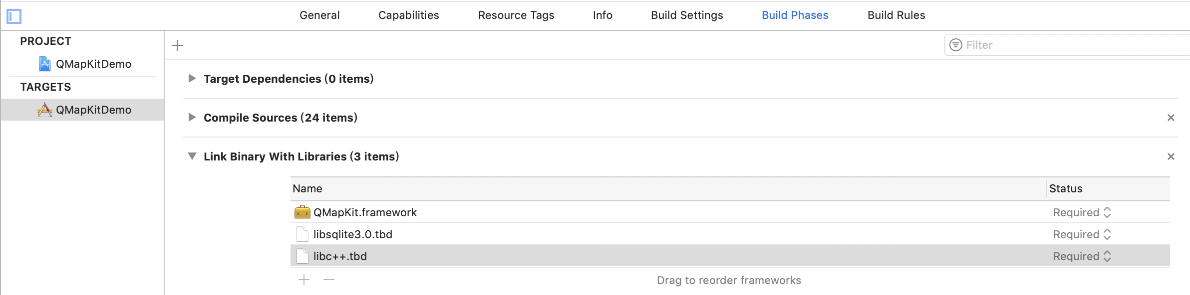 3D地图需要依赖 libsqlite3.tbd、libc++.tbd、QMapKit.framework,最终 3D 地图配置截图如下: