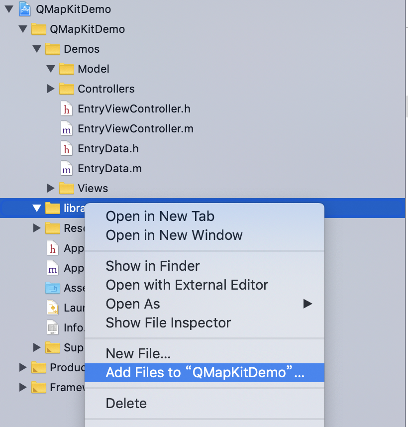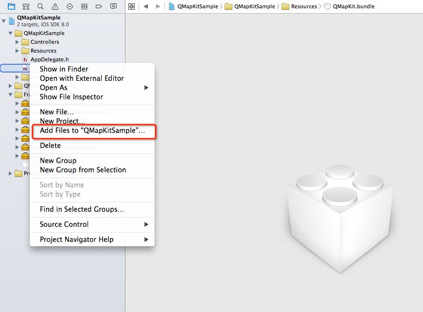 在工程界面右键弹出菜单中选择"Add Files To...",从文件夹sdk(同步骤1)->QMapKit.framework中将资源文件QMapKit.bundle添加到工程中,在弹出窗口中勾选"Copy items into destination group's folder(if needed)" 。