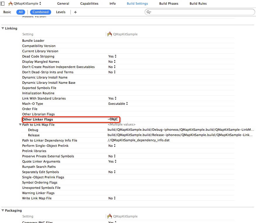 添加需要的编译选项,在TARGETS-Build Settings-Other Linker Flags 中添加如下内容: -ObjC 。