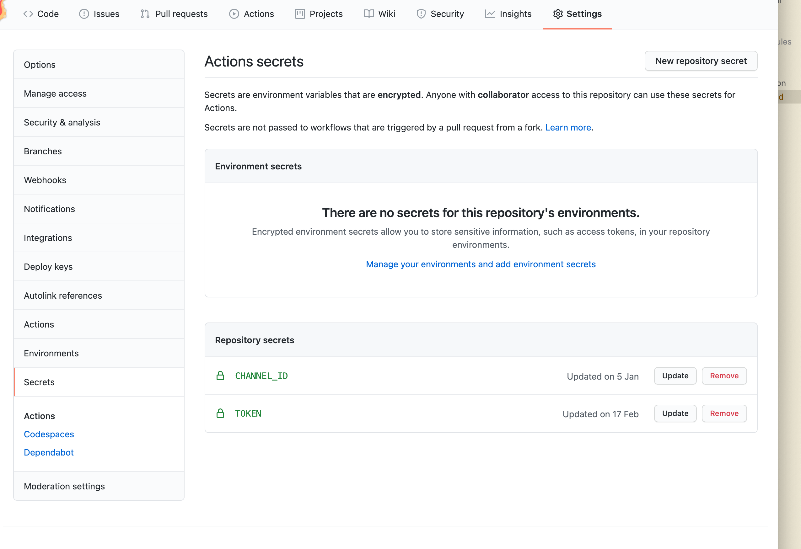 在github的项目设置中设置TOKEN和CHANNEL_ID