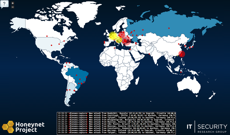 HoneyMap is a web application which visualizes a live stream of GPS locations on a SVG world map. In principle, it can be used with any stream of GPS data. For our application, we use honeypot captures, provided by several hpfeeds from the Honeynet Project. For more information on our instance of HoneyMap, see HoneyMap - Visualizing Worldwide Attacks in Real-Time.