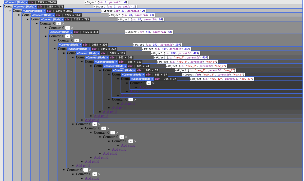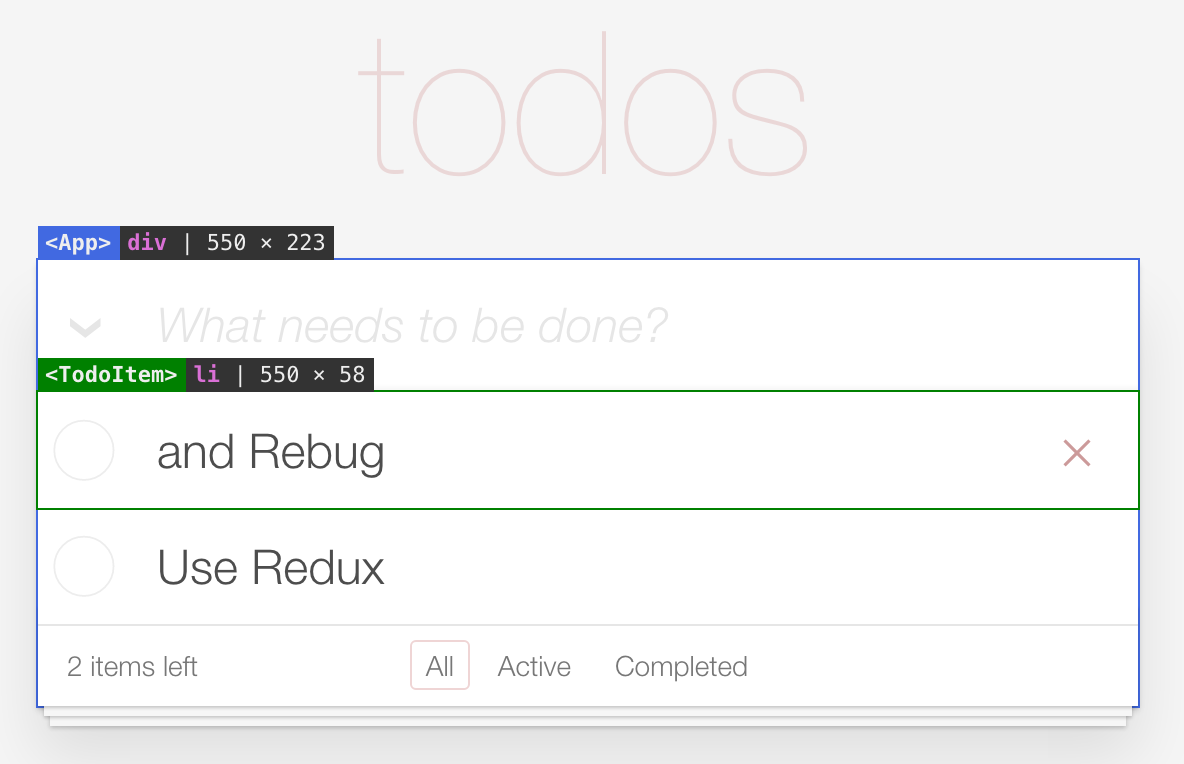 export default debug(config)(connect(mapStateToProps, mapDispatchToProps)(SomeComponent))- Show component's name, DOM tag name, dimensions