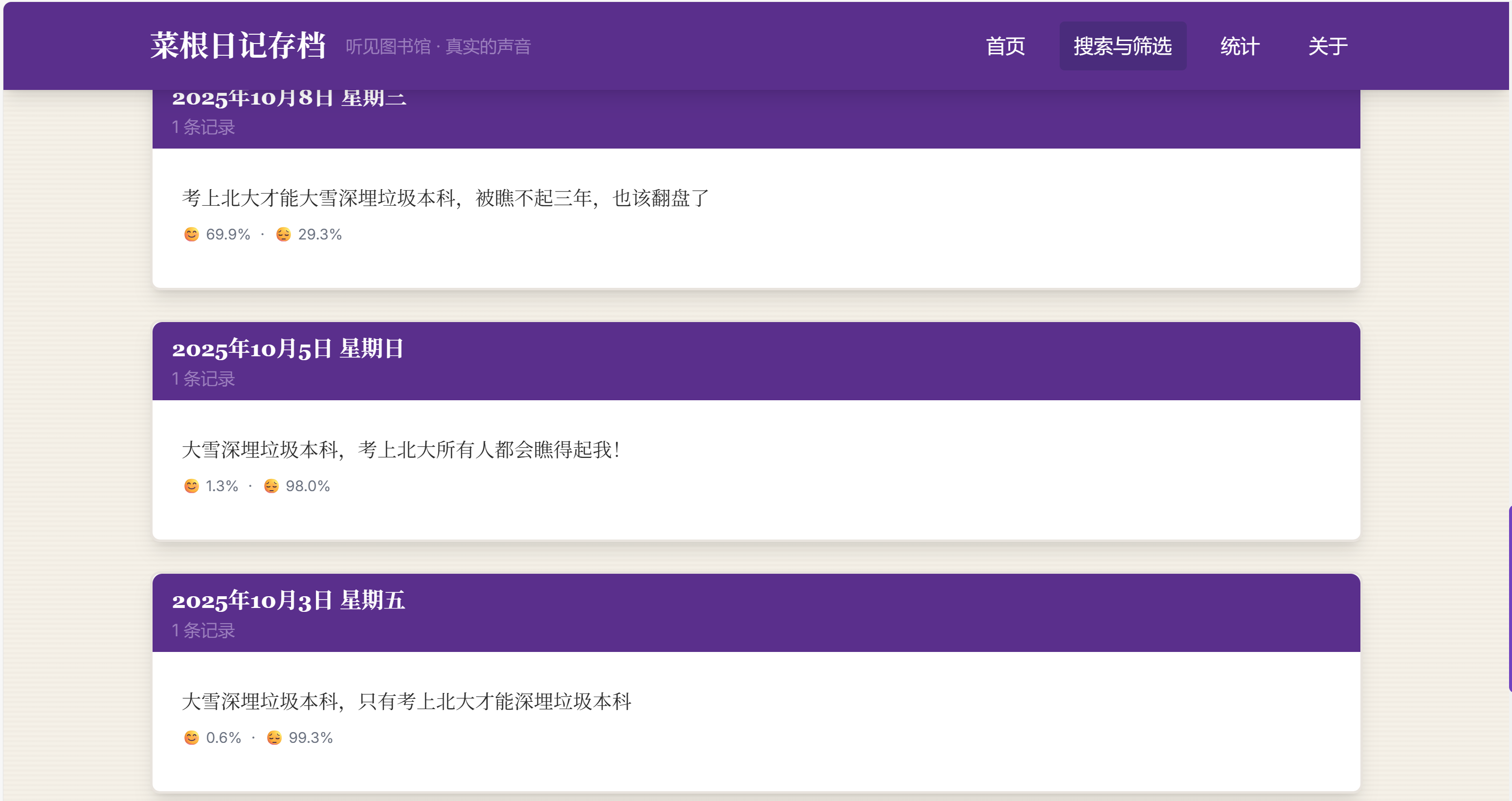 菜根日记是南大同学线下自发的日记活动,记录了来图书馆学习的同学们的思绪:吐槽,抱怨,鼓励……流露着真实的南大人的心声。 但是菜根日记可能存在着被清空的风险(也许某一天被某一位同学不小心删除了?或者是图书馆更换电脑了),因此数字化保存有一定的必要,所以我计划维护这个仓库,作为菜根日记的数字化存档。