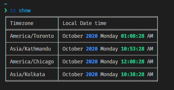 $ tz remove --name "Asia/Kathmandu"$ tz show$ tz selectGet UTC time based on current system time.