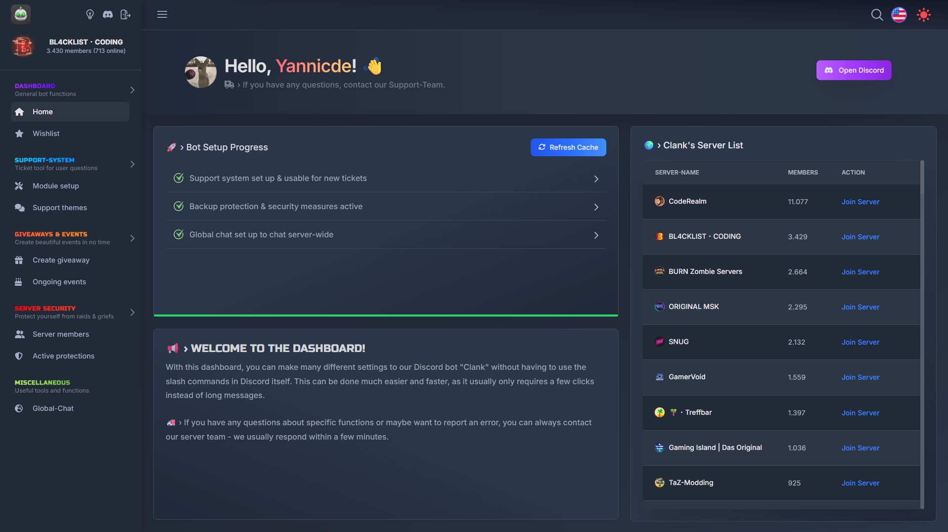 โบ This project provides the frontend for the dashboard of my own public Discord bot "Clank" and is also actively used to configure modules and general settings of it. I hope that maybe some people can learn something from it when they look at the project.