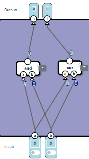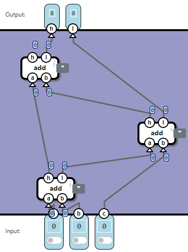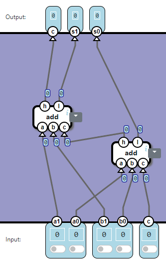 The component Full Adder adds three bits: a, b, and c. The output is a two-bit value. The h output is the high bit, the l is the low bit:
