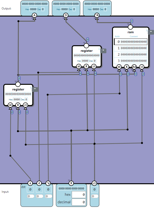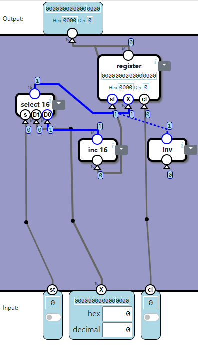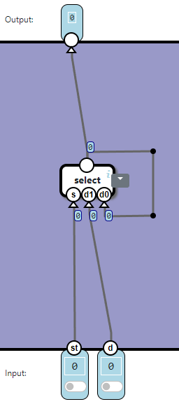 - Output: The lamp is controlled by bit 0 and 1 of X. When bit 1 is 1, the lamp should get a signal on on. When bit 0 is 1, the lamp should get a signal on off. Signals should be sent to the hardware when st (store) is 1 and cl (clock signal) is 1.