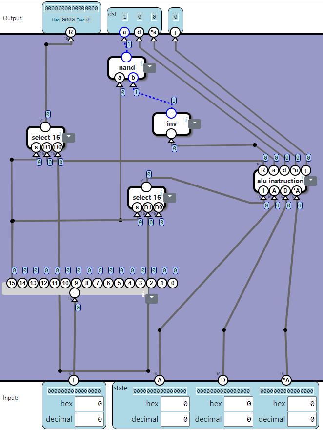 The word at the PC address in the program memory is the I input to the control unit. Each clock cycle changes the program counter depending on j: If j=0, the program counter should advance with 1. If j=1, the program counter should be set to the value on A.