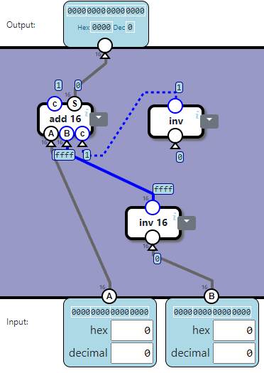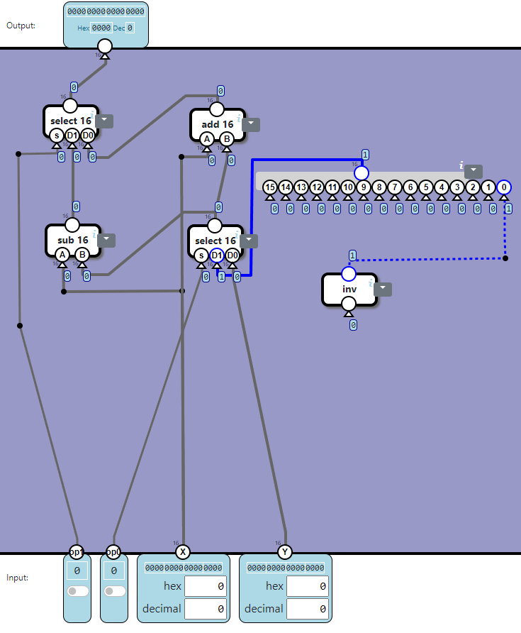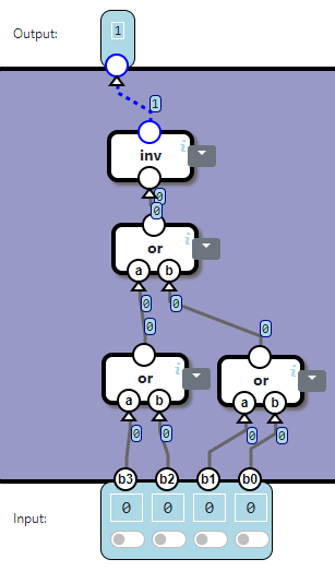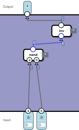 Our next task is to build an inverter (inv) component. This inv-component has a single input and a single output. The output should be the opposite of the input, which can be visualized in the following tableau:
