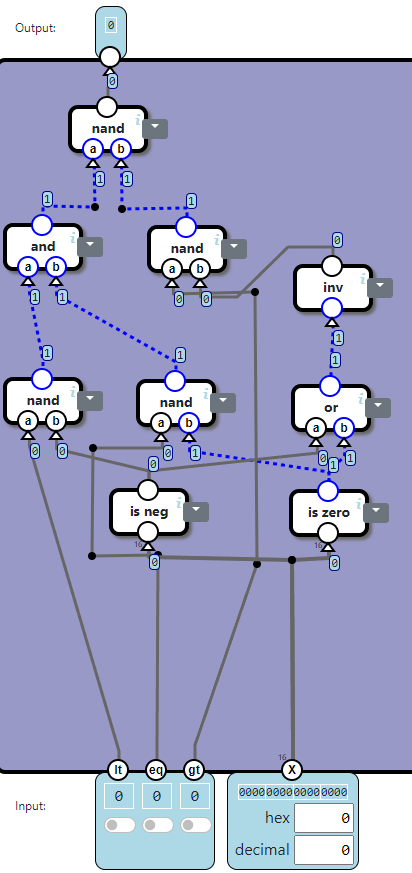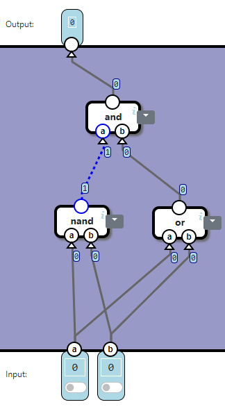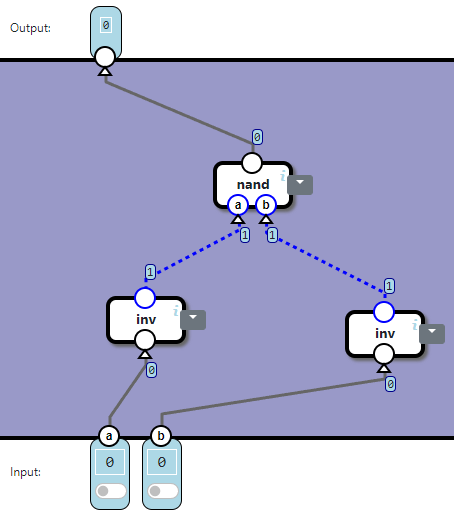 Our task is to connect inputs to output through wires and relays such that when both a and b inputs are 1, the output is 0. 1 represents electrical current, 0 represents no current. The V input carries constant current, i.e. always 1. The exact specification: