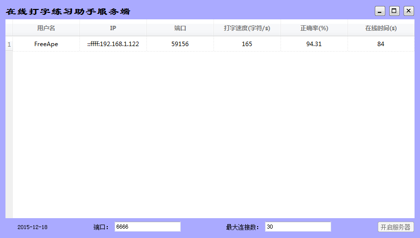 通过基于QT中QTcpServer和QTcpSocket以及UI编程,实现了基于TCP协议的C/S模型在线打字练习软件助手,服务端处理各客户端打字数据,以及显示在线打字客户列表即实时更新打字数据。客户端可实现离线打字练习以及在线打字练习,其中在线打字练习可以与在线用户比拼打字速度,并显示排名。