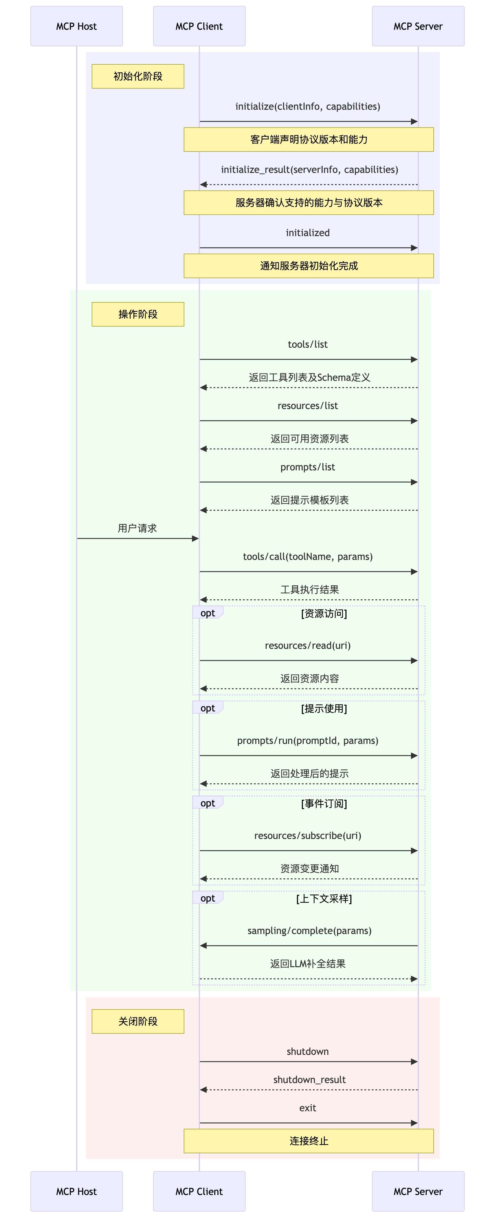 MCP 为客户端-服务器连接定义了严格的生命周期,以确保正确的功能协商和状态管理。生命周期分为三个阶段:初始化、操作和关闭。