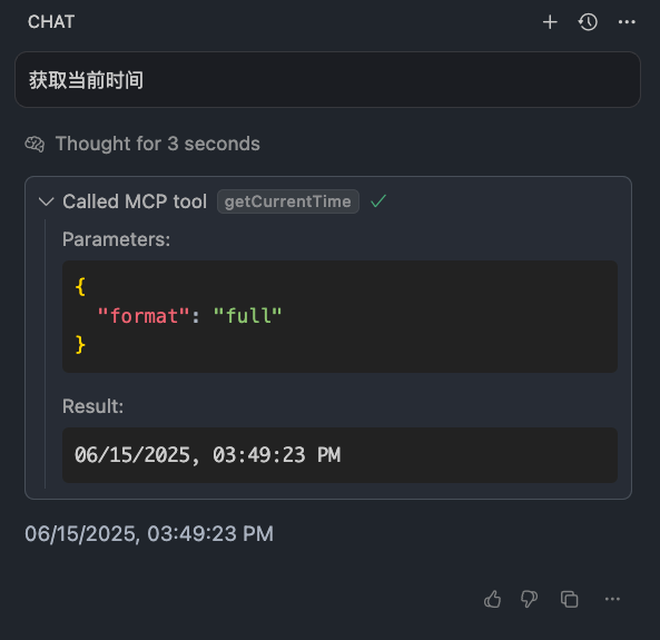 const result = await client.callTool("getCurrentTime", { format: "full", timezone: "Asia/Shanghai" }); // 结果: { content: [{ type: "text", text: "2023-04-01 12:34:56" }] }