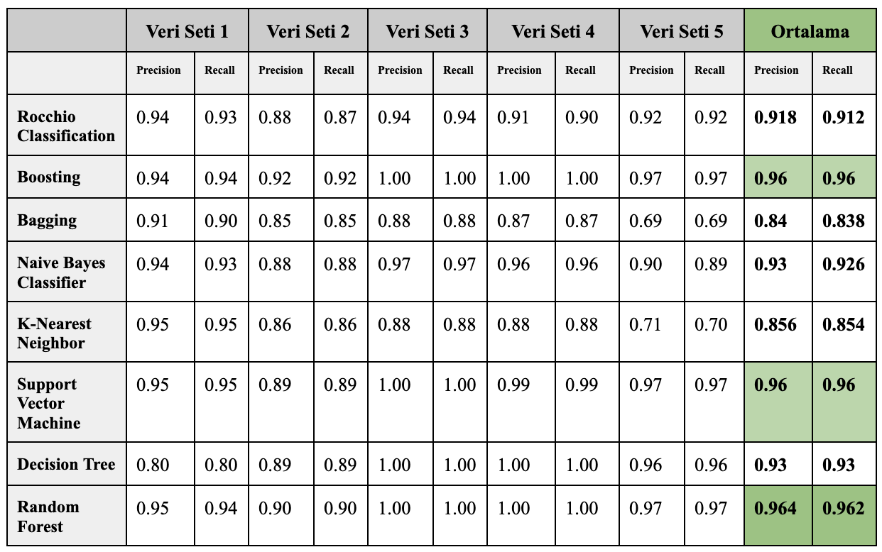 Abstract: In this study, within the scope of Machine Learning techniques on 5 different data sets, techniques such as Rocchio Classification, Boosting, Bagging, Naive Bayes Classifier, K-Nearest Neighbor, Support Vector Machine, Decision Tree, Random Forest will be implemented through an interface and these results will be compared.