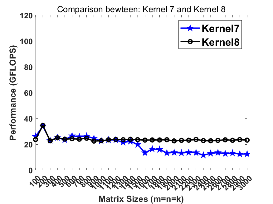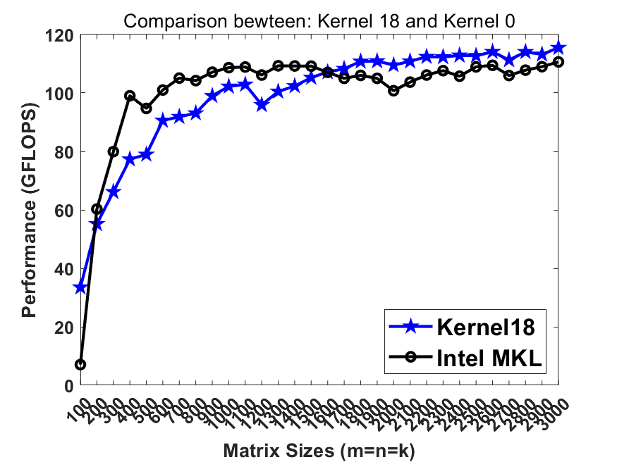 We notice that the performance around 30 GFLOPS cannot be maintained when data cannot be held in cache. Therefore, we introduce cache blocking to maintain the good performance when matrix sizes are small.