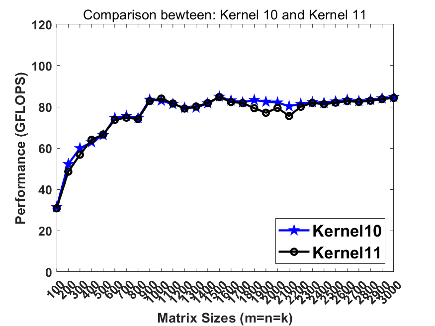 Previously in kernel10 we pack the matrix B into totally continous memory. Recalling that the L2 cache contains multiple cache line buffers so that the L2 hardware prefetcher can prefetch the data from lower memory hierarchy. In this step, breaking the continous memory access in B can benefit the L2 hw prefetcher so that the memory latency can be further hidden.