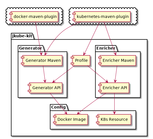 One intention of extracting these parts from the originating plugins is also to separate Maven related and non-Maven related functionality so that the non-Maven parts can be reused for other build systems and IDEs like Gradle or Eclipse. Some thin adapter Maven specific modules like jkube-kit-enricher-maven and jkube-kit-generator-maven are provided as glue to get to the Maven specific build information like the project's coordinates.