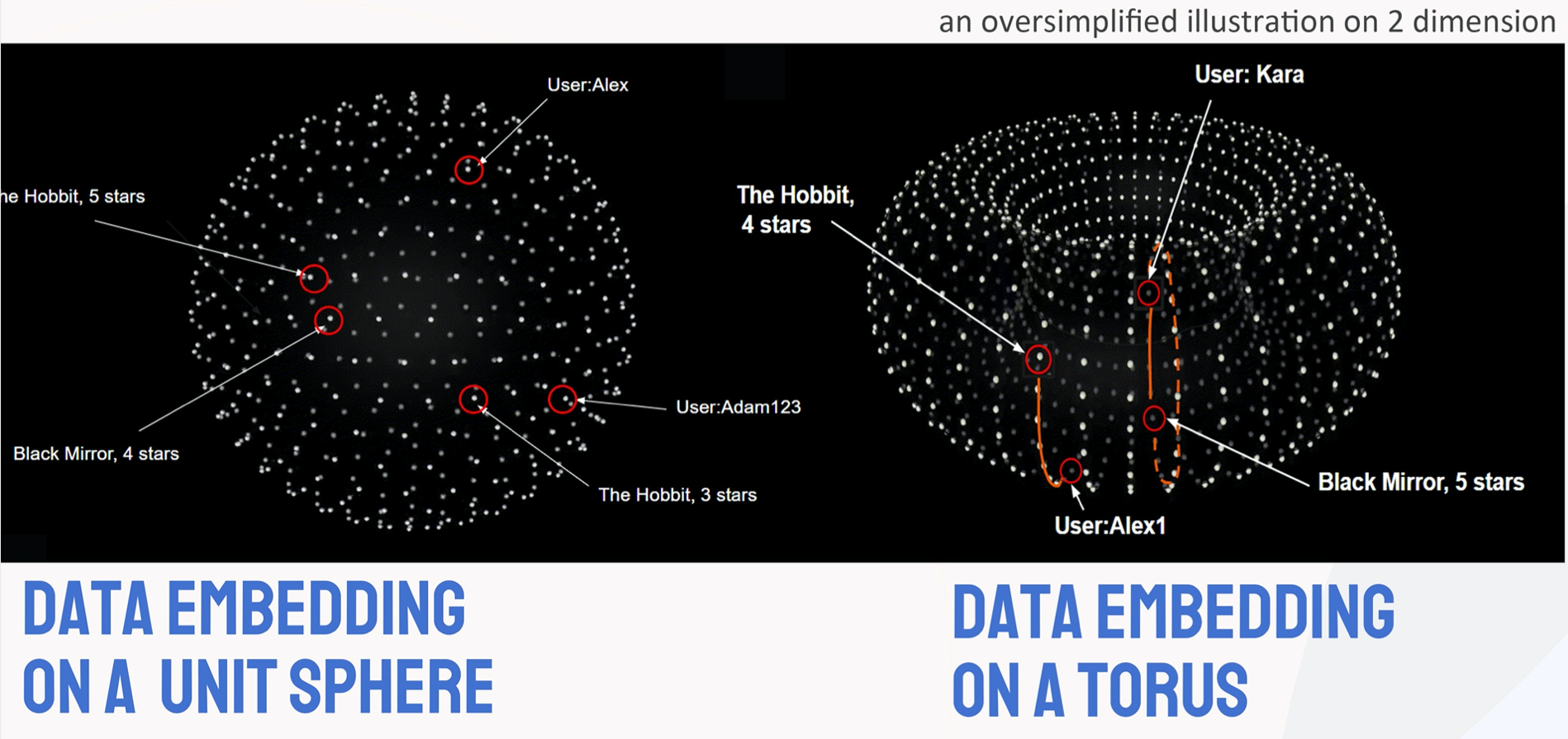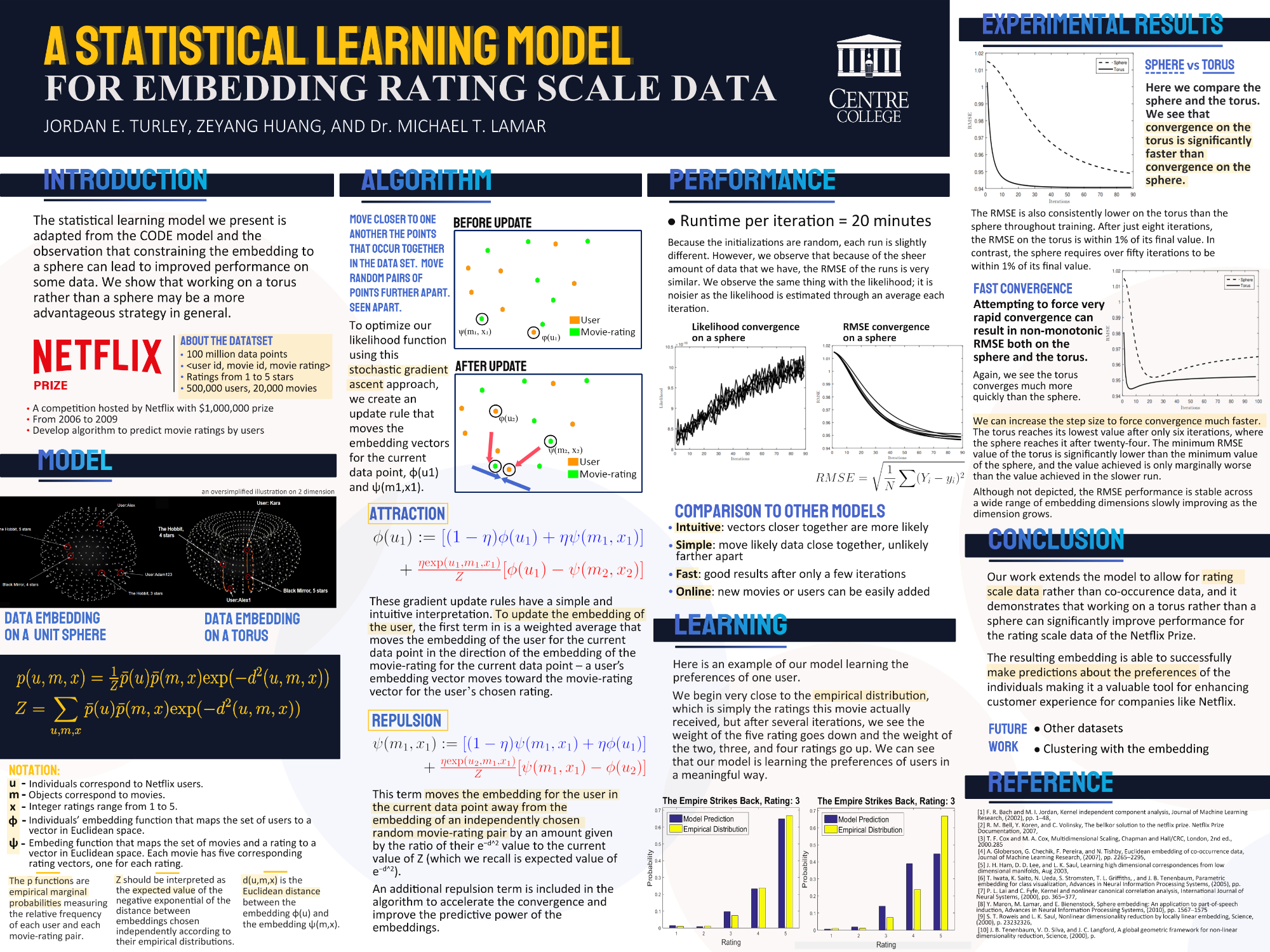 Our implementation takes a genetic or biological approach to solve this problem. We begin by creating a random vector for each user and each movie-rating (each movie has five possible ratings, so each movie gets five vectors). We put these vectors on a high dimensional unit sphere or torus. One can basically think of putting a random point on a ball, like a basketball or a soccer ball. We go through each user-movie-rating pair and attract the two closer together. We also repel these vectors away from random vectors to avoid all vectors converging to the same point. The user vector is repelled from a given number of random movie-rating vectors, and the movie-rating vector is repelled from a random number of user vectors. Then, the user vector is repelled from a random user vector, and the movie-rating vector is repelled from a random movie-rating vector.