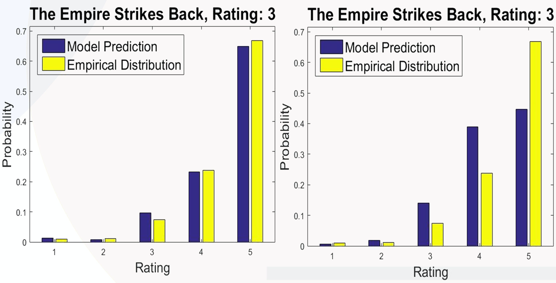 Below, we see a real example of our algorithm learning a user's movie preferences. We selected a user that gave the movie "The Empire Strikes Back" a rating of 3. On the left is the predictions of the algorithm with no training, and on the right is the predictions after several iterations of training. Our algorithm begins predicting very close to the marginal distributions since the initialization is random, but after training, our algorithm learns that the user would likely give this movie a lower rating. The learning isn't perfect, but we do much better than we would do by predicting the marginal distribution. The video can be seen here or the start and finish can be seen below: