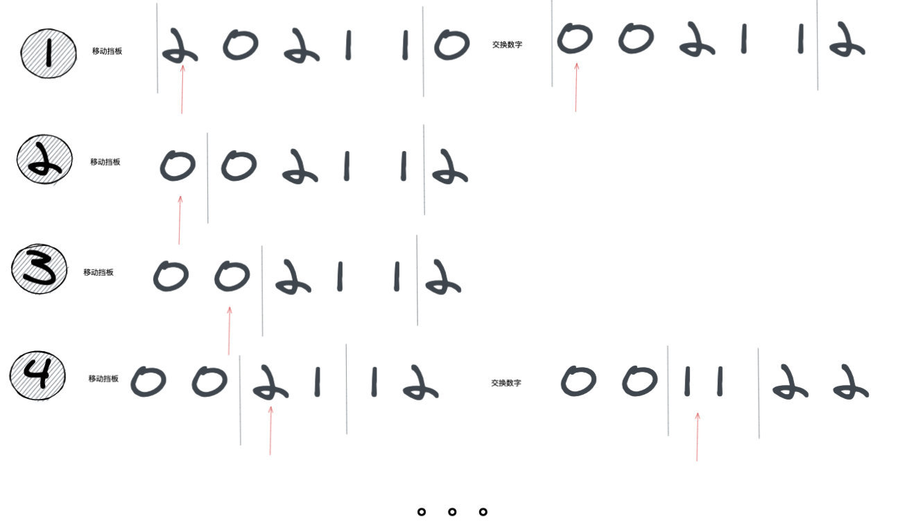 我们可以把数组分成三部分,前部(全部是 0),中部(全部是 1)和后部(全部是 2)三 个部分。每一个元素(红白蓝分别对应 0、1、2)必属于其中之一。
