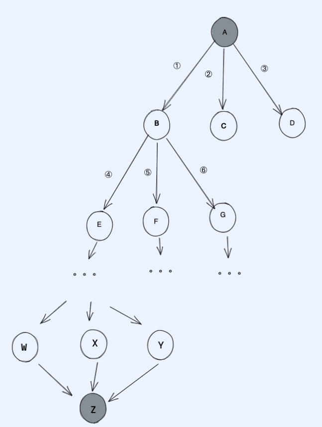 如下图,我们遍历到 A,有三个选择。此时我们可以任意选择一条,比如选择了 B,程序会继续往下进行选择分支 2,3 。。。