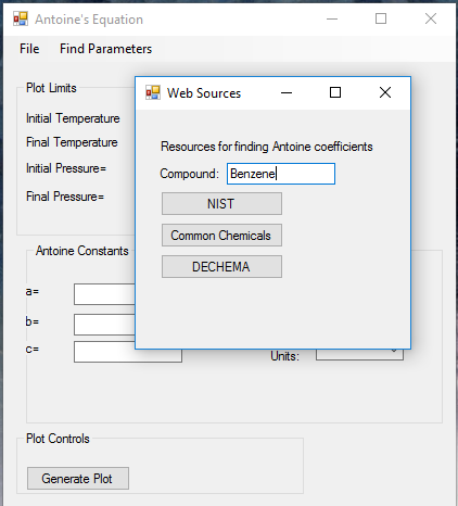 The software also includes a quick method for obtaining a component's antoine coefficients through NIST, tables, and DETHERM. Additional text references are given as well.