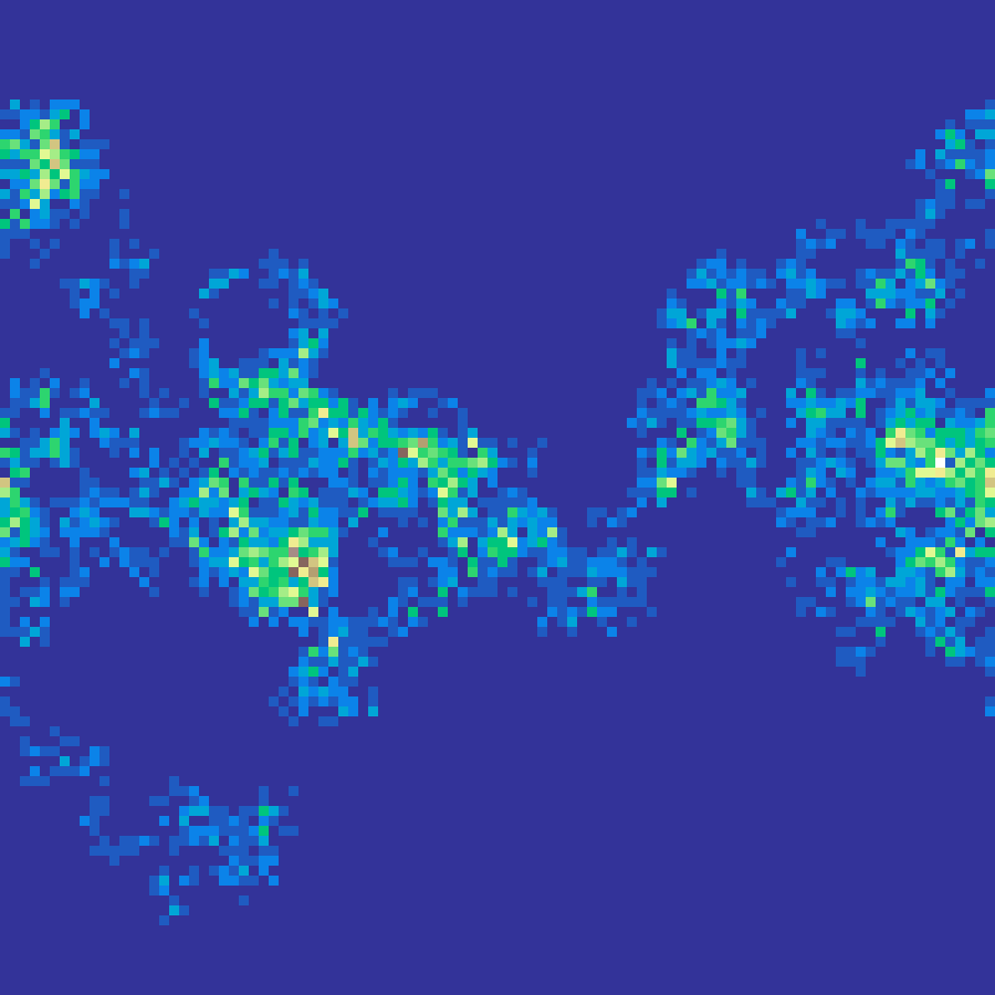 A random walk where each step direction is drawn from a wrapped normal distribution centred on the previous heading. Higher kappa values produce straighter, more directional trajectories; kappa = 0 reduces to isotropic Brownian motion. The visit-density map models correlated animal movement or dispersal paths.