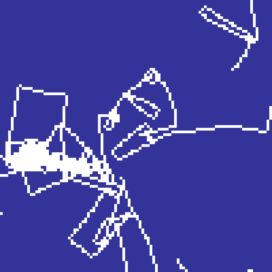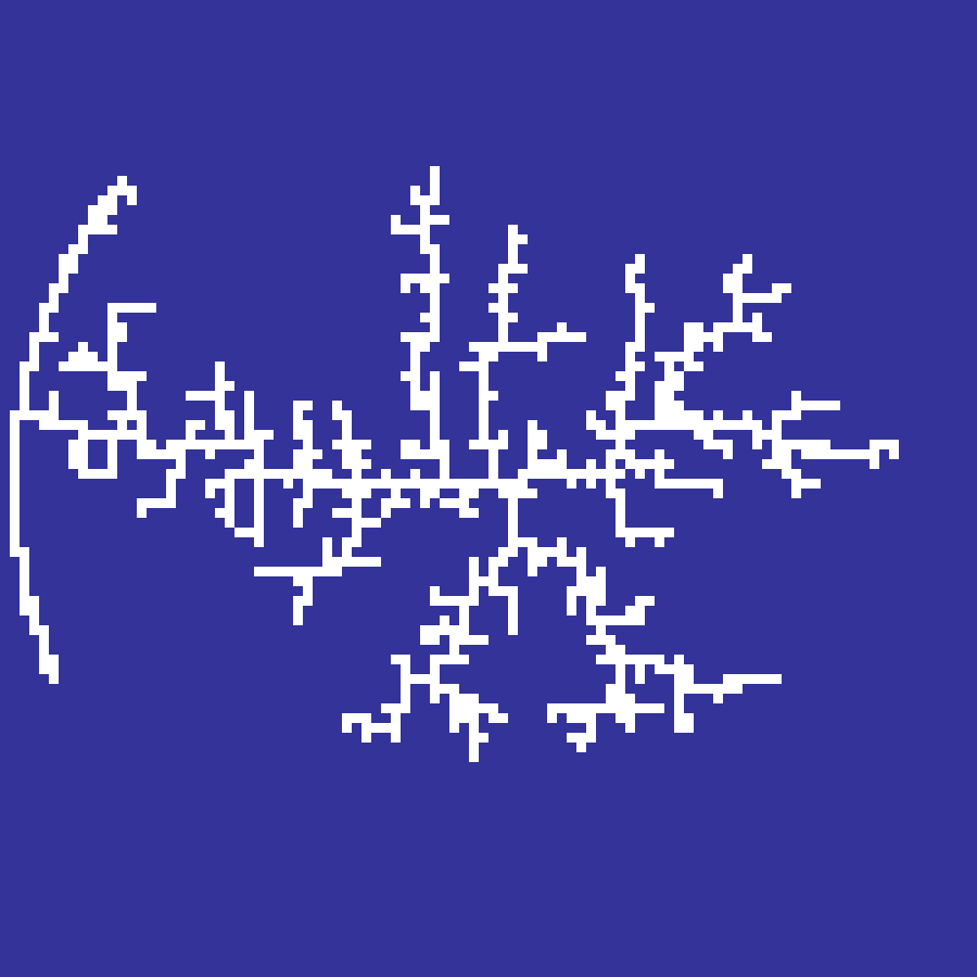 Jared Tarbell's crack propagation algorithm. Cracks originate from random seed points and propagate with a small Gaussian angular deviation each step. When a crack meets an existing crack it deflects perpendicularly, producing an organic network of intersecting fractures reminiscent of dried mud or cracked glaze.