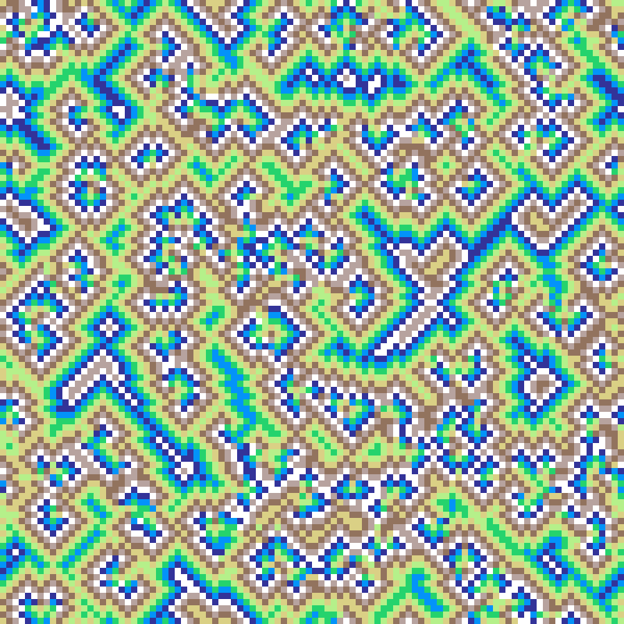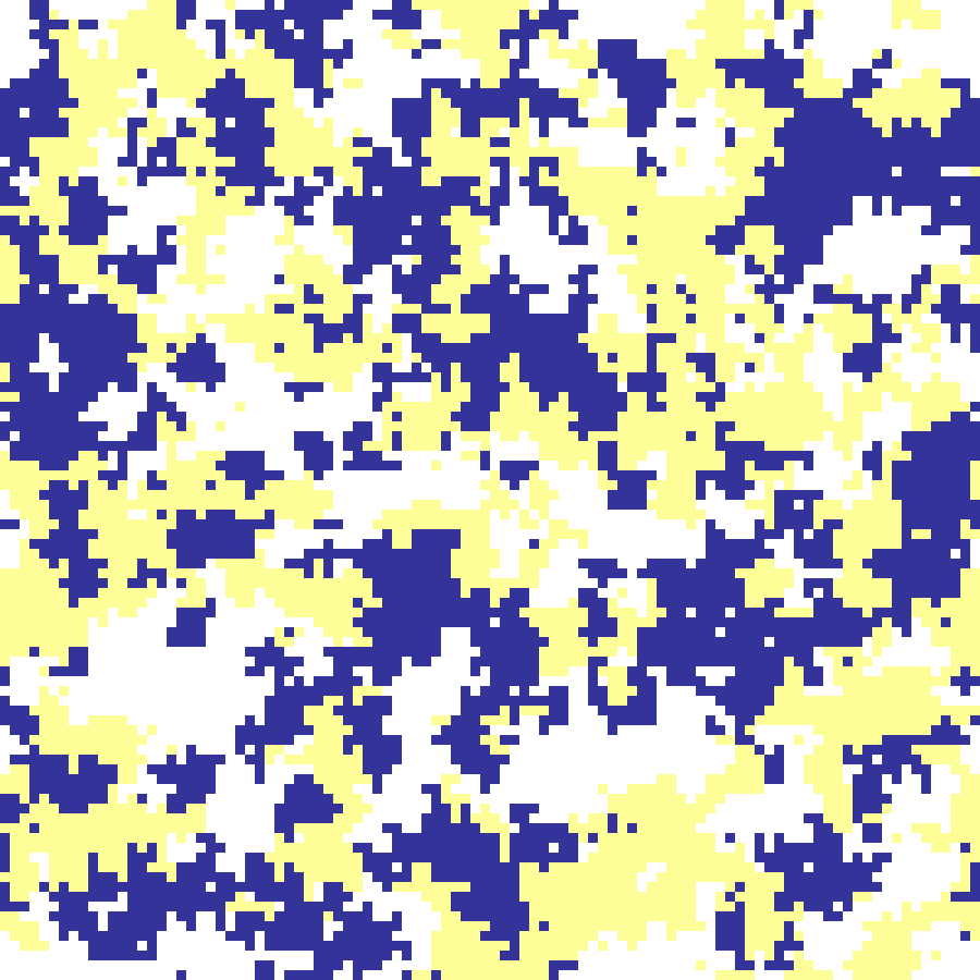 rock_paper_scissors(rows: 100, cols: 100, iterations: 200, seed: 42)