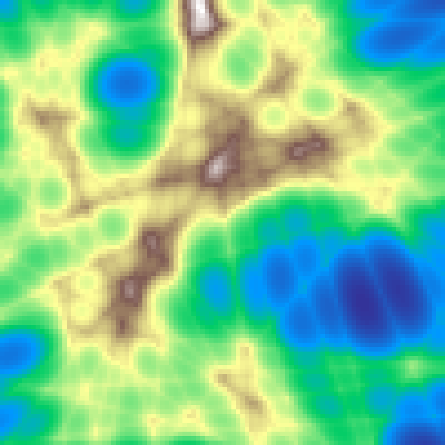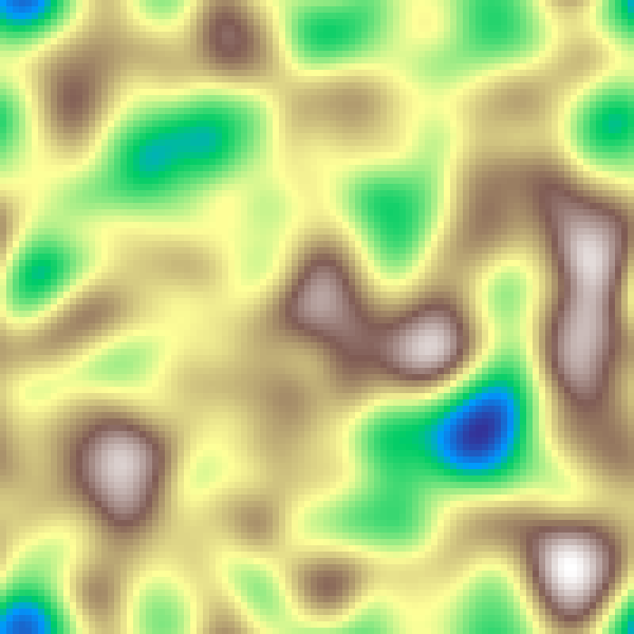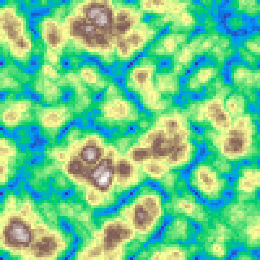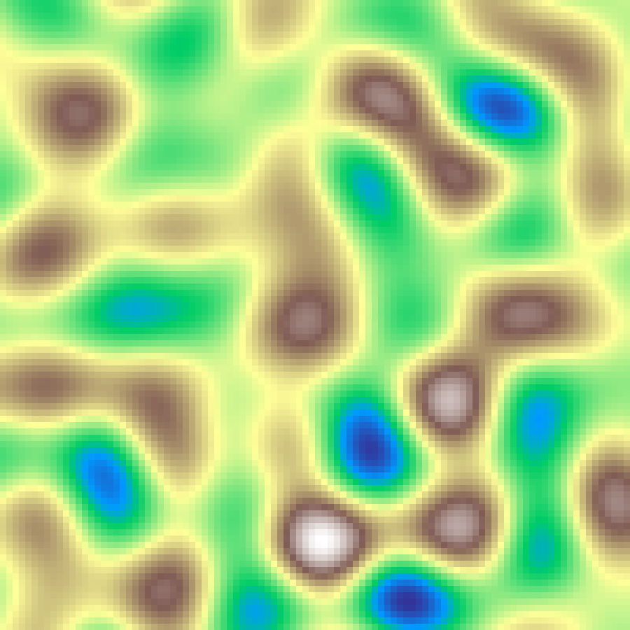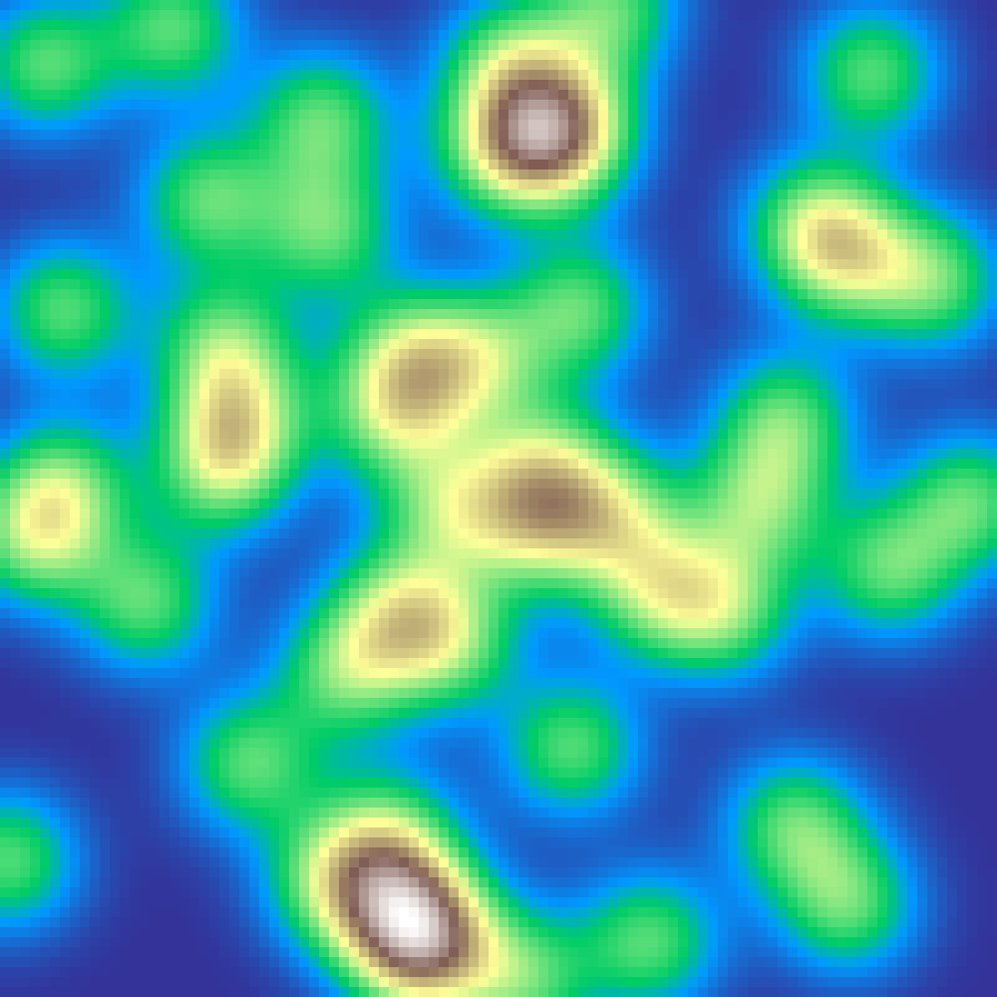 Places random Gaussian kernel centres and accumulates their contributions across the grid, then rescales to [0, 1]. Produces smooth blob-like elevation fields.