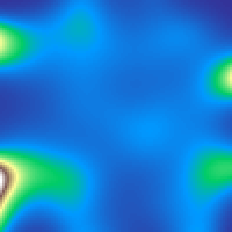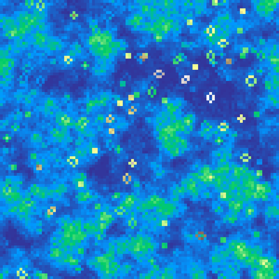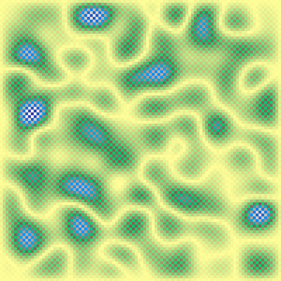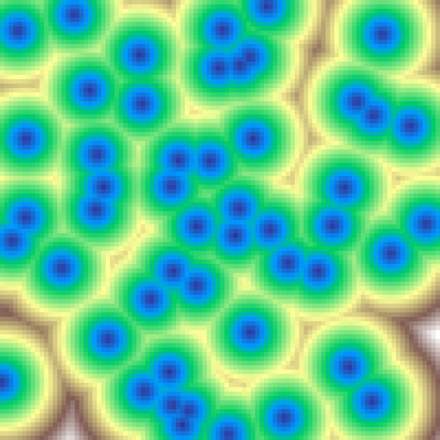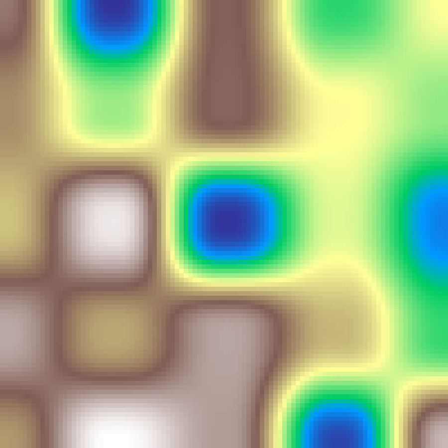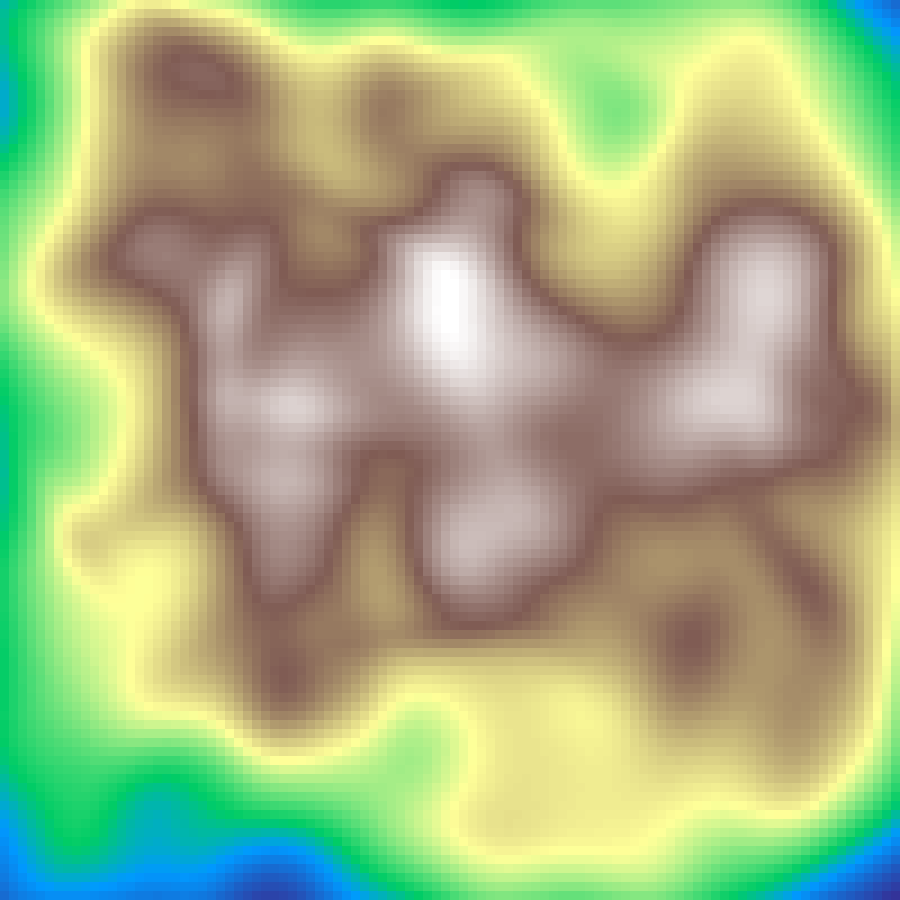 Places random Gaussian kernel centres and accumulates their contributions across the grid, then rescales to [0, 1]. Produces smooth blob-like elevation fields.