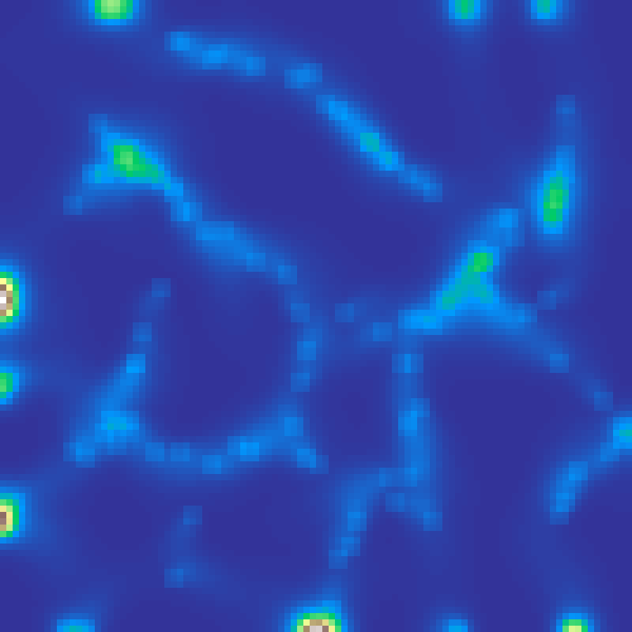 Euclidean distance transform from random seed cells, producing a smooth radial falloff from 0 at the seeds outward to 1 at the most distant point.
