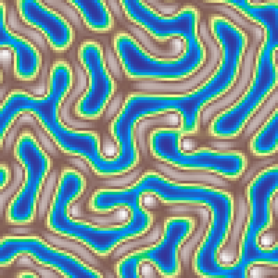 Gray-Scott reaction-diffusion model where two chemicals (A and B) diffuse and react across the grid. Different feed/kill combinations produce spots, stripes, labyrinths, and other Turing-pattern morphologies.