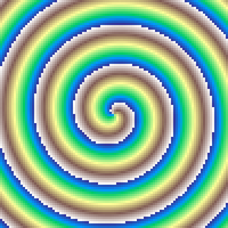 Archimedean spiral radiating outward from the grid centre. Values increase along the spiral arms; turns controls how many full rotations span the grid radius.