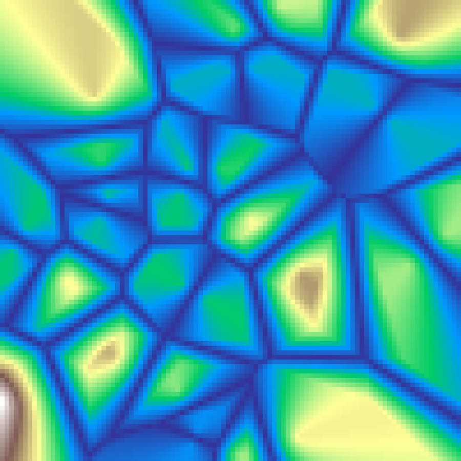 Cell noise built from distances to random feature points, producing cellular, cracked-earth, or mosaic-like patterns.